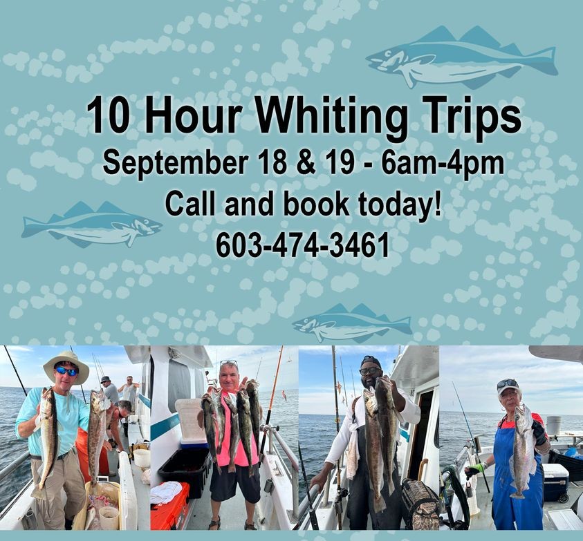 Cod season is open until end of October. Room on the special Whiting trips 9/18-19,